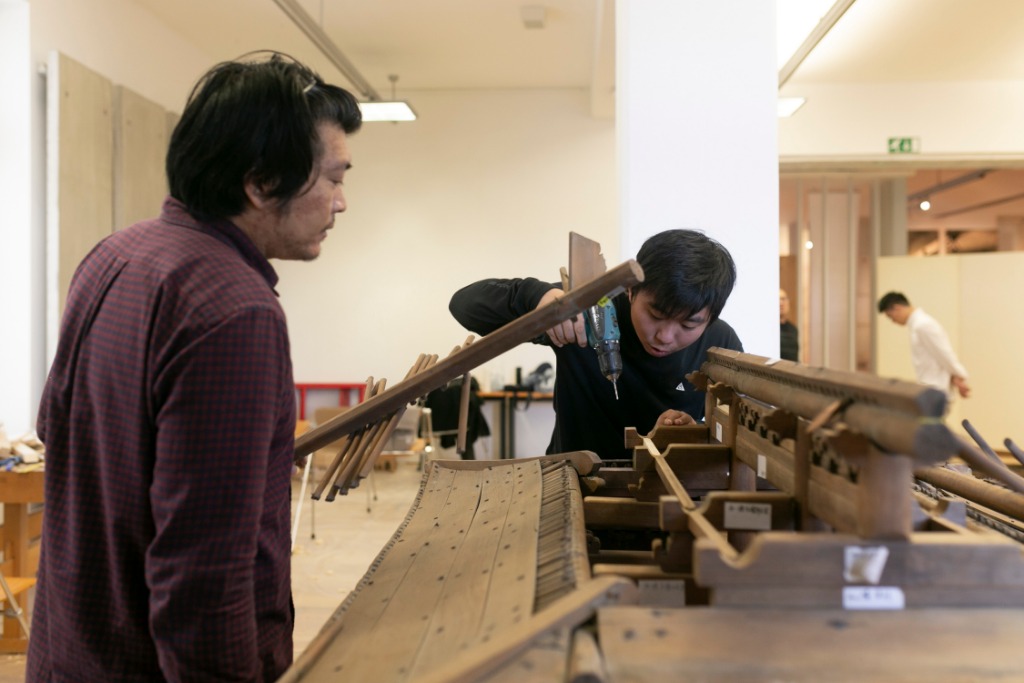 10月16日,在斯洛文尼亚卢布尔雅那的民族志博物馆,故宫博物院专家鲍杰(左)和史孙明修复中国古建筑木质大门模型。新华社发(泽利科·斯特凡尼奇摄)