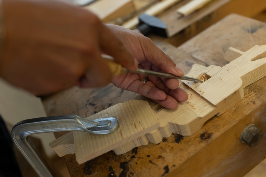 10月10日,在斯洛文尼亚卢布尔雅那的民族志博物馆,故宫博物院专家鲍杰制作大门模型缺失的部件。新华社发(泽利科·斯特凡尼奇摄)