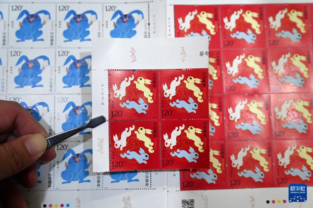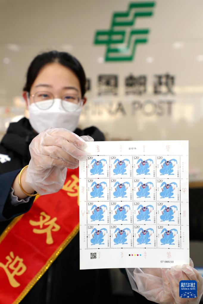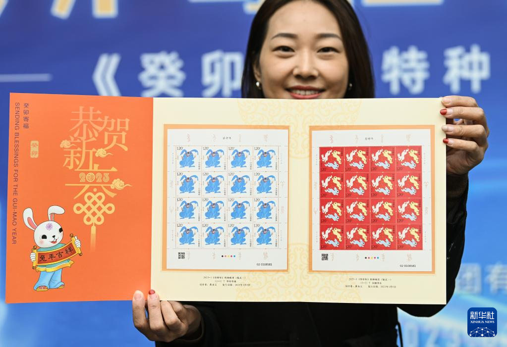1月5日,在山东东营,邮政工作人员展示《癸卯年》特种邮票。
