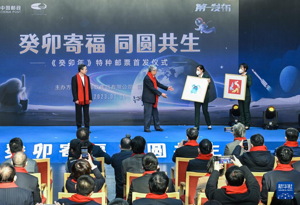 1月5日,嘉宾在邮票首发仪式现场为《癸卯年》特种邮票启幕。