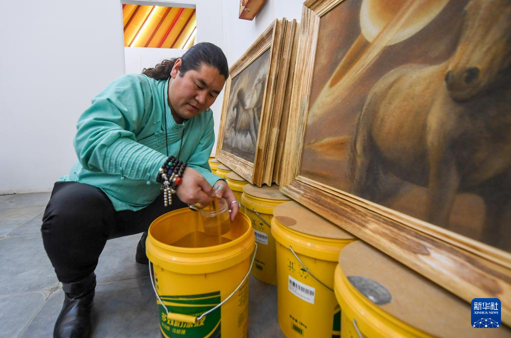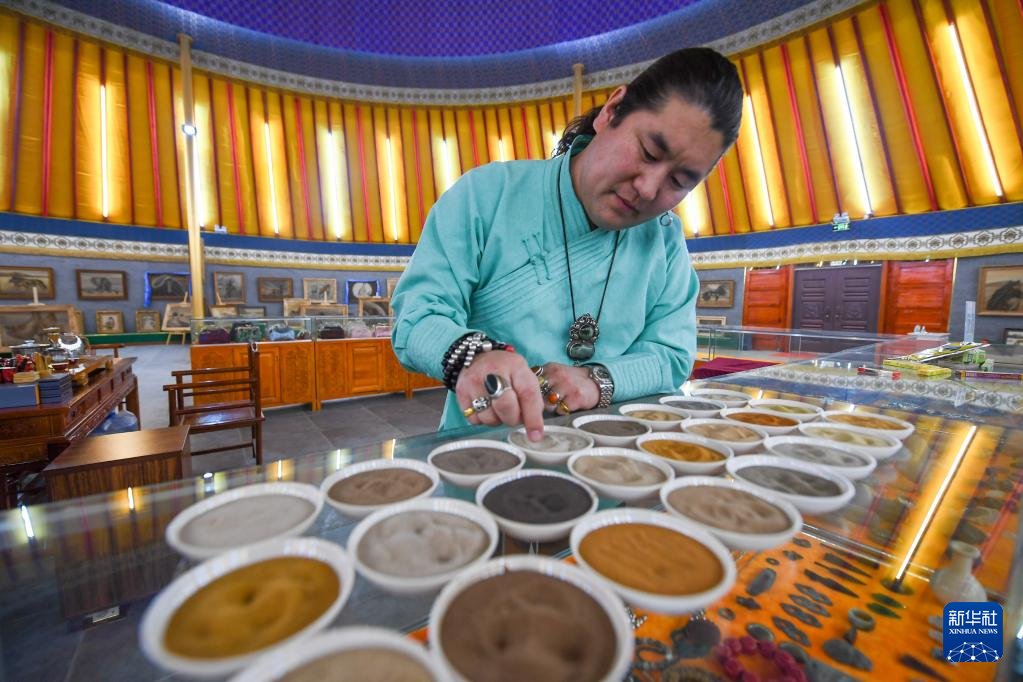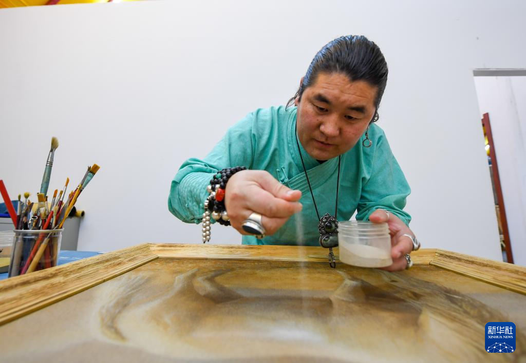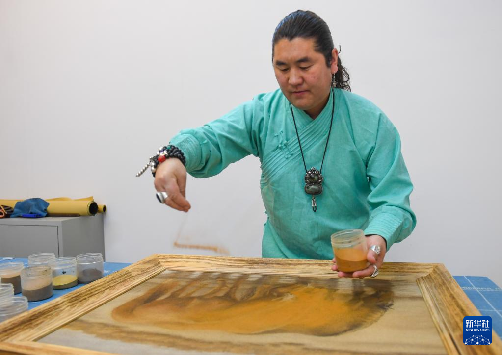 内蒙古锡林郭勒盟正蓝旗位于浑善达克沙地腹地,生活于此的80后蒙古族青年阿拉腾毕力格取沙为材,进行沙画艺术作品创作。他对浑善达克沙地中颜色各异的沙粒进行淘洗、筛选、清理杂质、晒干等操作后,加上用糯米汁、牛角等材料熬制而成的天然胶水,就能使各色沙粒在充分粘贴的情况下,依然保持其色彩。他的沙画作品色彩自然、造型古朴,独具特色。