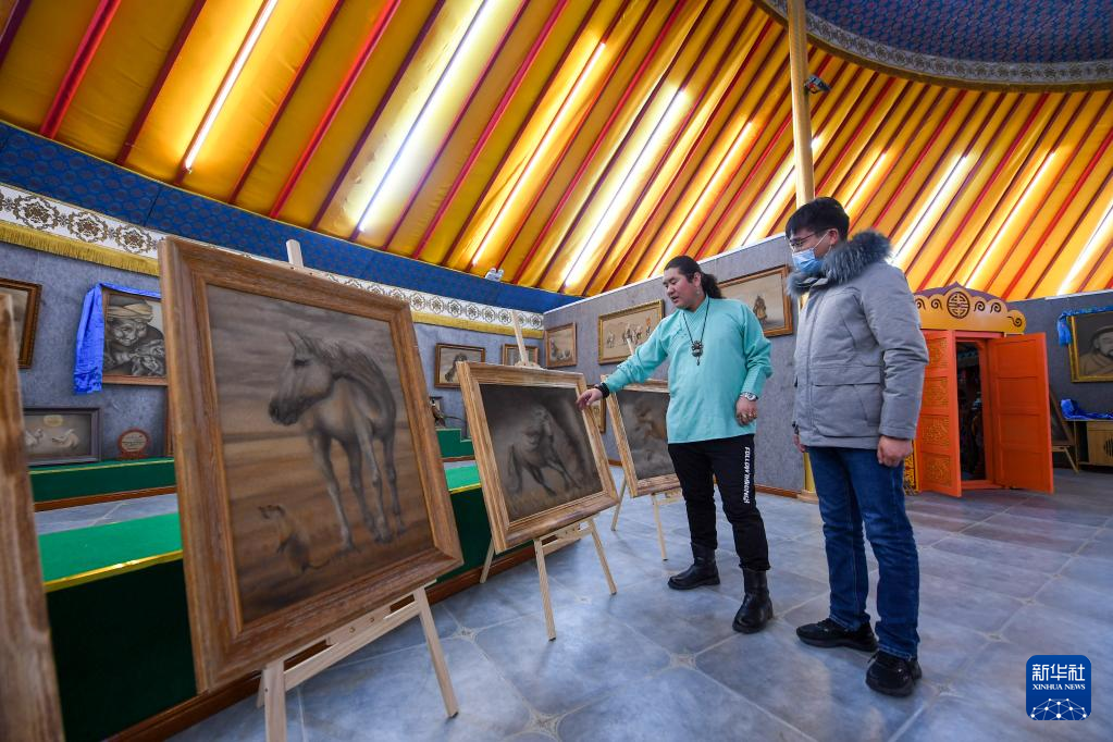 1月4日,阿拉腾毕力格(左)为游客(右)介绍自己创作的沙画艺术作品。