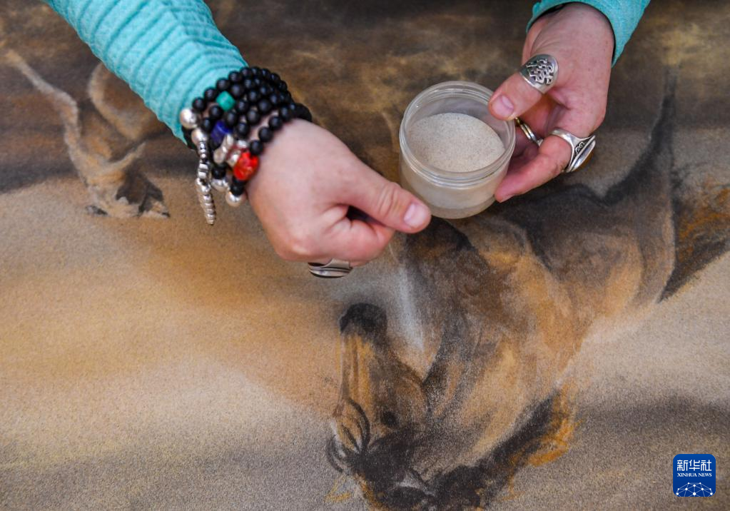 1月4日,阿拉腾毕力格在工作室内创作沙画。