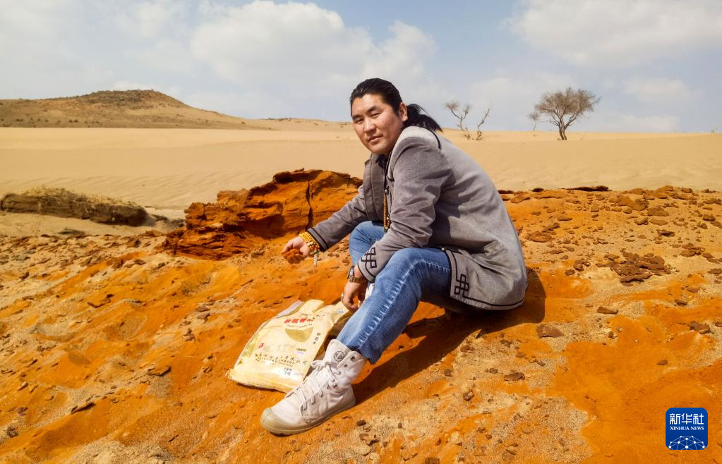 阿拉腾毕力格在浑善达克沙地中寻找适合制作沙画的沙粒(2017年摄)。