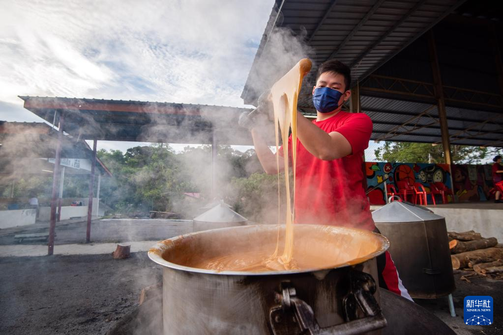 1月8日,在马来西亚首都吉隆坡以北约70公里的新古毛,工作人员在搅拌年糕。