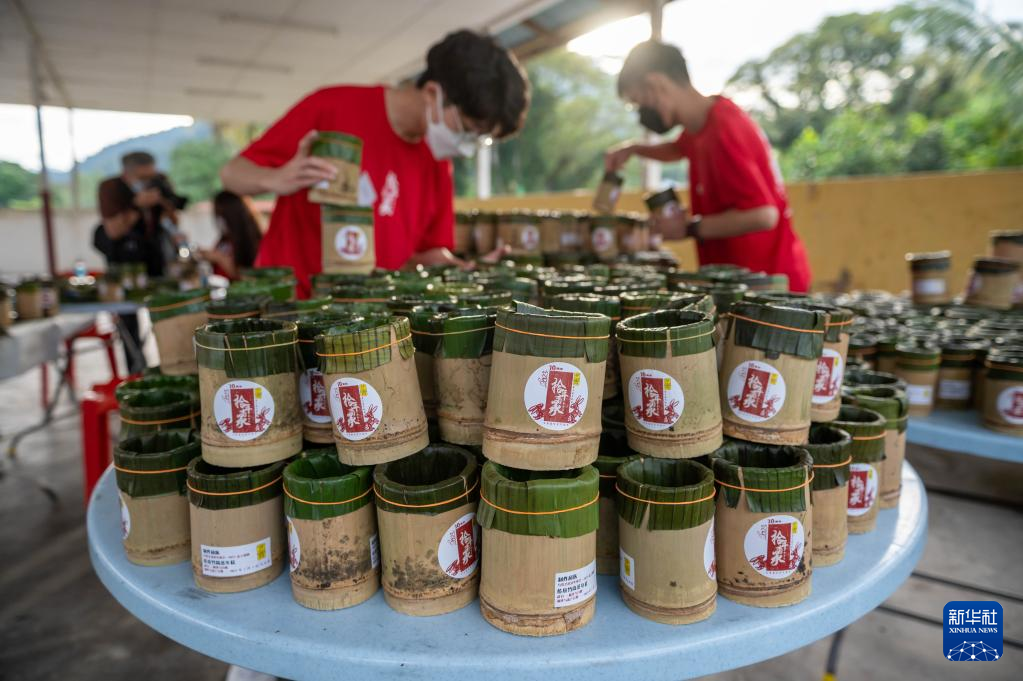 1月8日,在马来西亚首都吉隆坡以北约70公里的新古毛,工作人员把蒸好的年糕盛到竹筒里。
