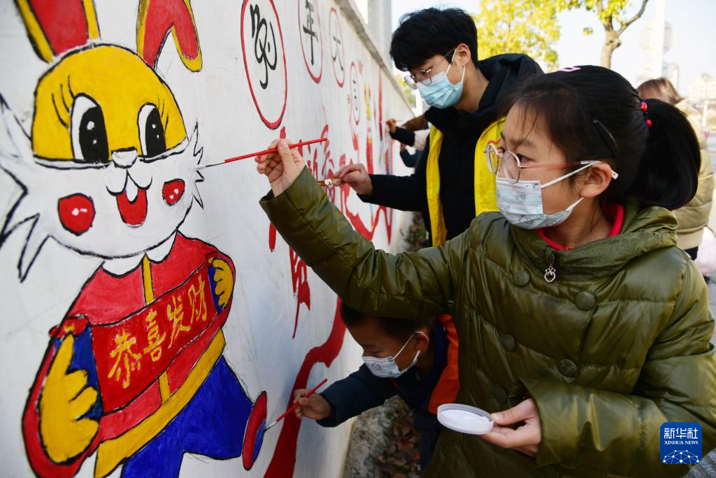 1月11日,在江苏省镇江市远洋社区,江苏大学志愿者和小朋友一起描绘“年俗文化”主题墙画。新华社发(石玉成摄)