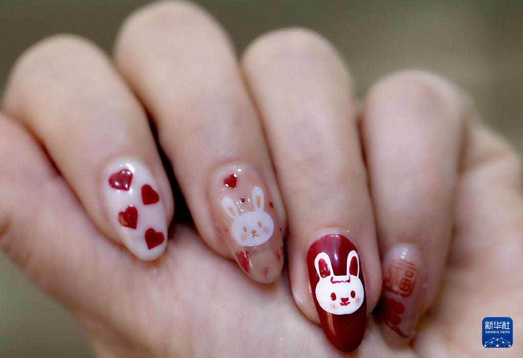 1月11日,在江苏连云港市连云区一家美甲工作室,一名女生展示生肖兔美甲。新华社发(王健民摄)