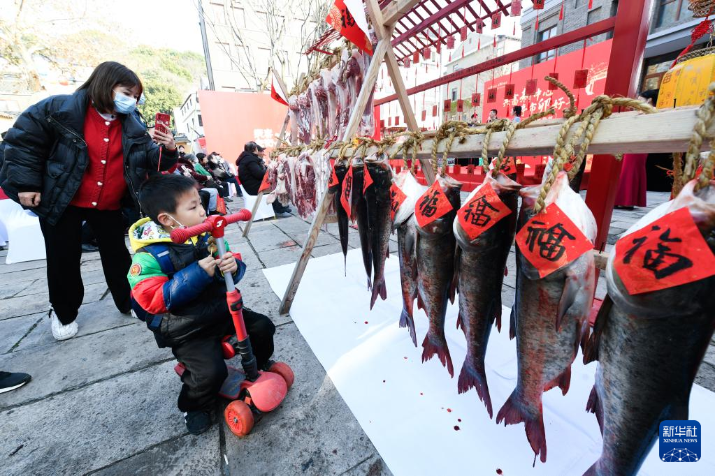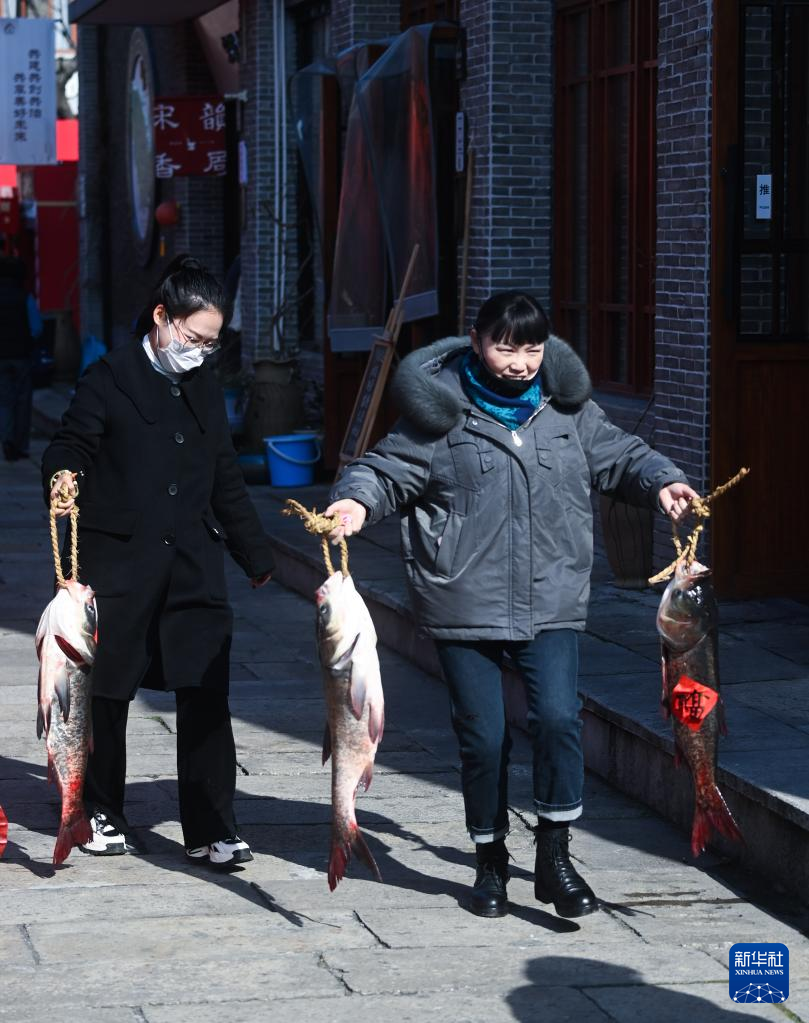 1月11日,人们在杭州市余杭区瓶窑镇瓶窑老街年货节上采购了特色年货鲢鱼。新华社记者 徐昱 摄