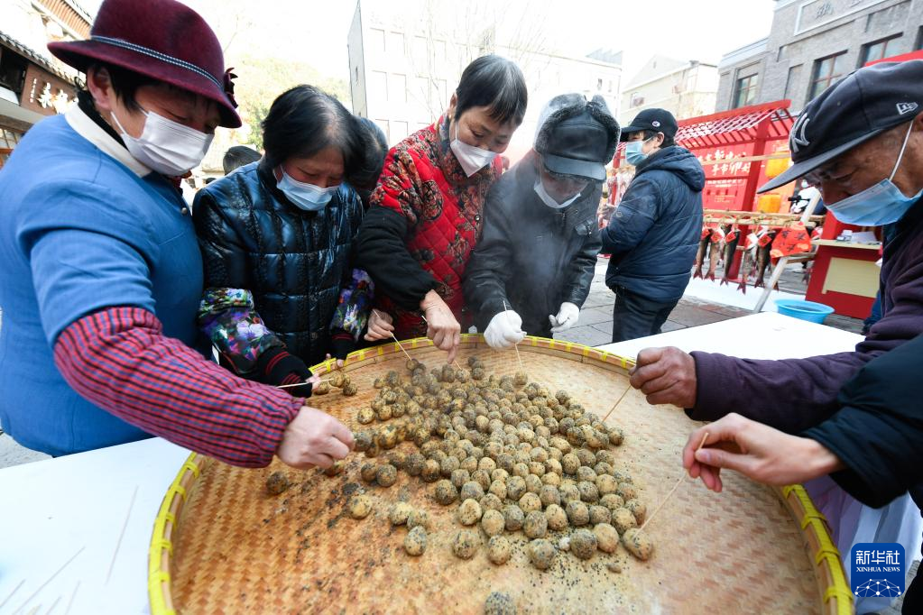 1月11日,人们在杭州市余杭区瓶窑镇瓶窑老街年货节上品尝特色小吃。新华社记者 徐昱 摄