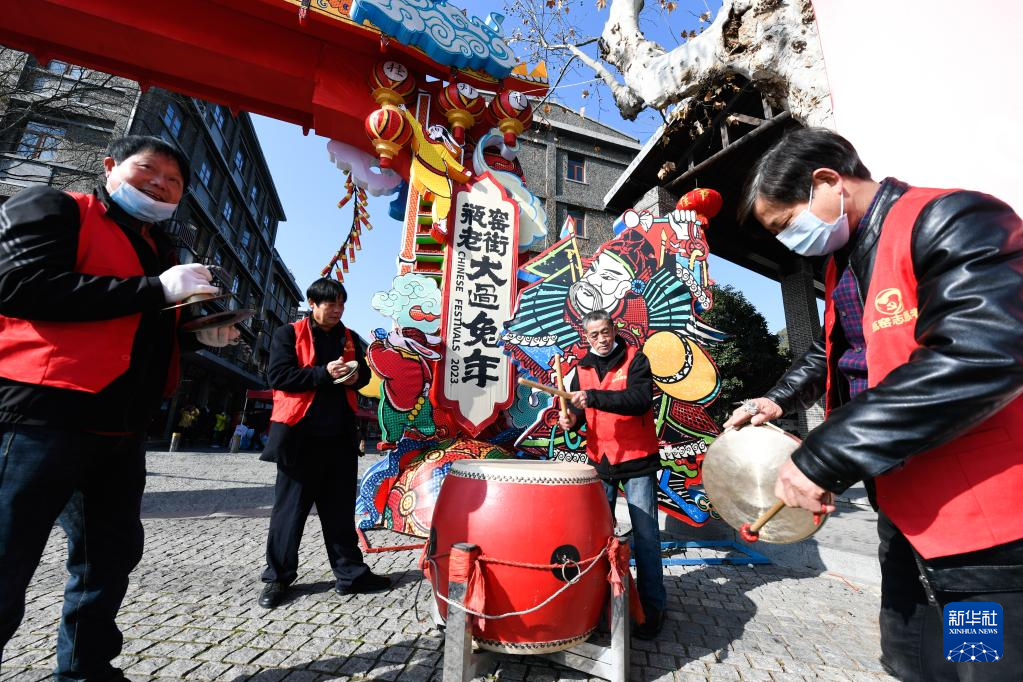 1月11日,人们在杭州市余杭区瓶窑镇瓶窑老街敲响新春锣鼓,庆祝老街年货节开幕。新华社记者 徐昱 摄