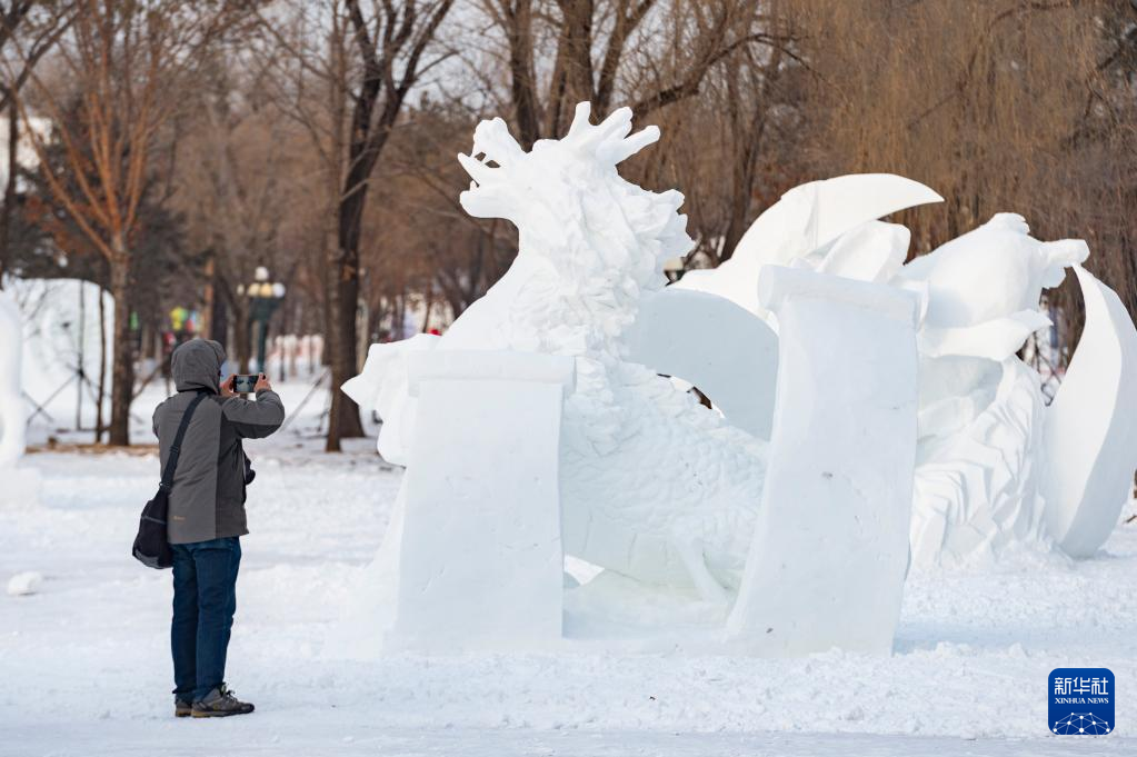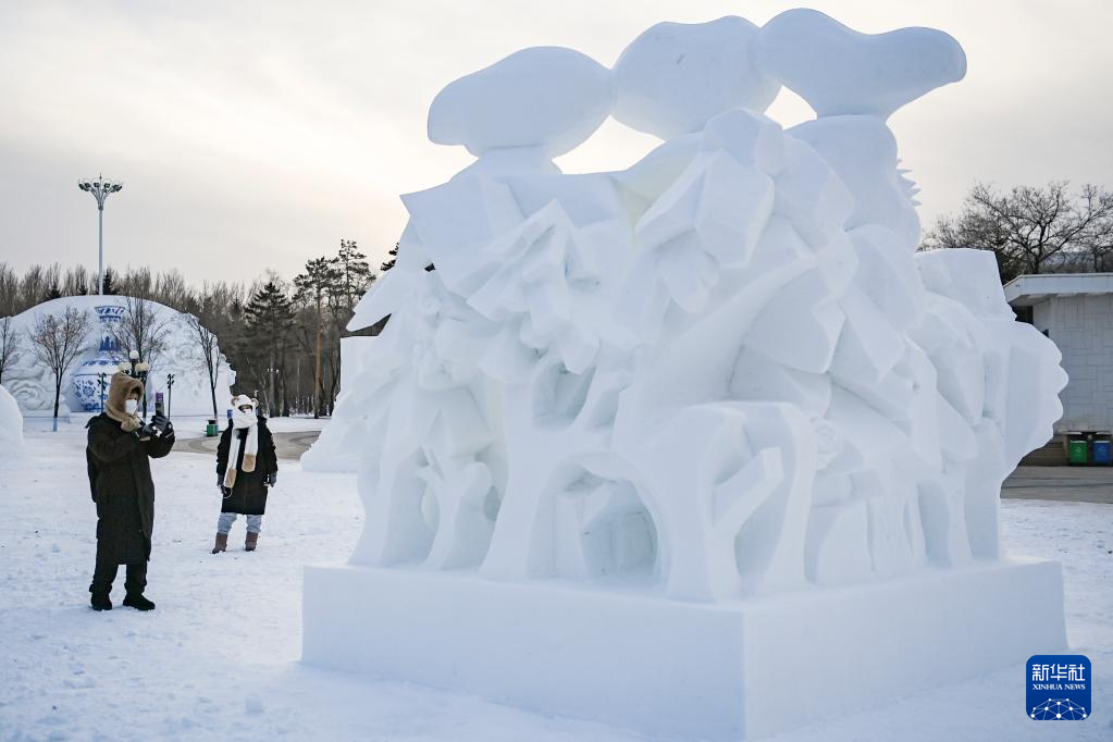 1月18日,在哈尔滨太阳岛雪博会园区,游客观赏参赛雪雕作品。
