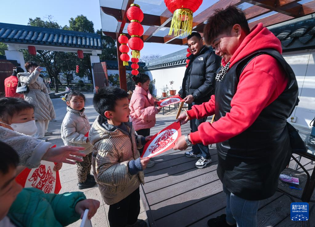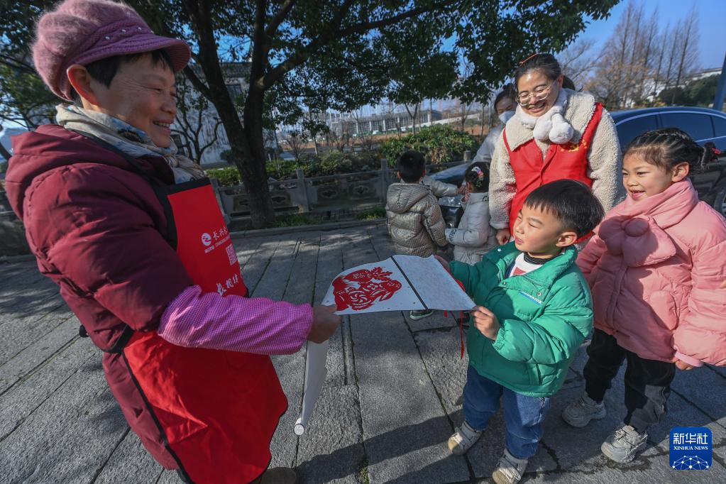 临近春节,浙江省湖州市长兴县李家巷镇中心幼儿园的教师志愿者带领孩子开展以“巧手剪纸迎兔年”为主题的迎新年民俗活动。孩子们在老师的指导下剪出各种福兔剪纸,并将福兔剪纸作品送到周边村民手中,表达辞旧迎新的美好愿望。