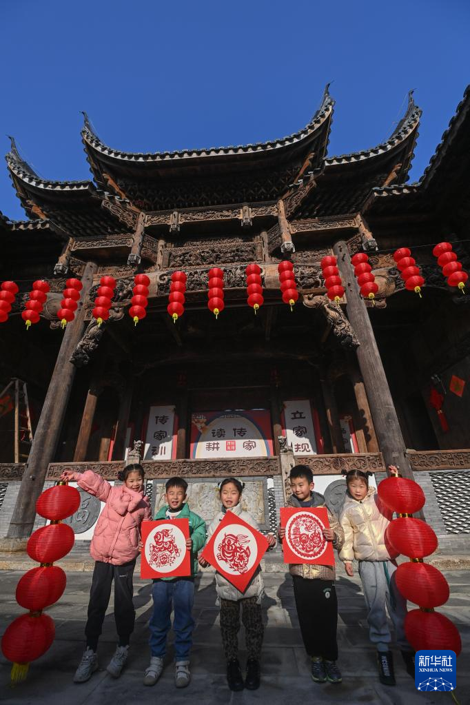 1月18日,在长兴县李家巷石泉村的古建筑“百桌厅”内,孩子们在展示各式各样的兔年剪纸。
