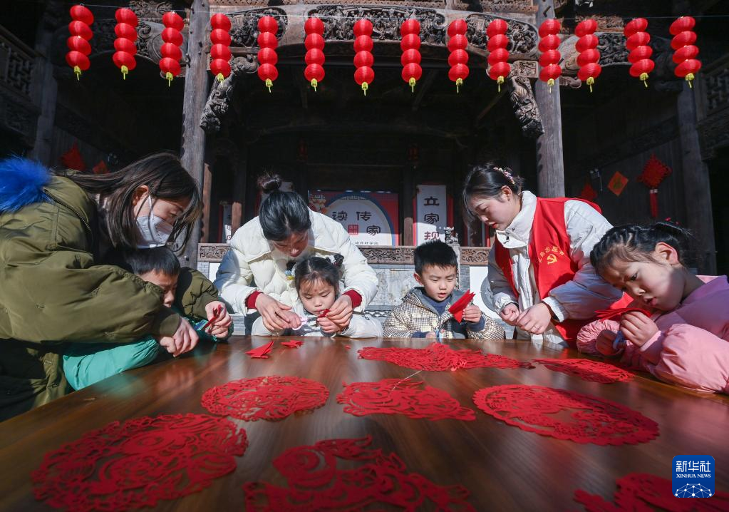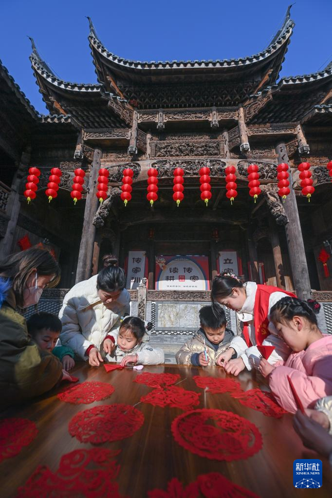 1月18日,在长兴县李家巷石泉村的古建筑“百桌厅”内,孩子们在志愿者的带领下学习剪纸。
