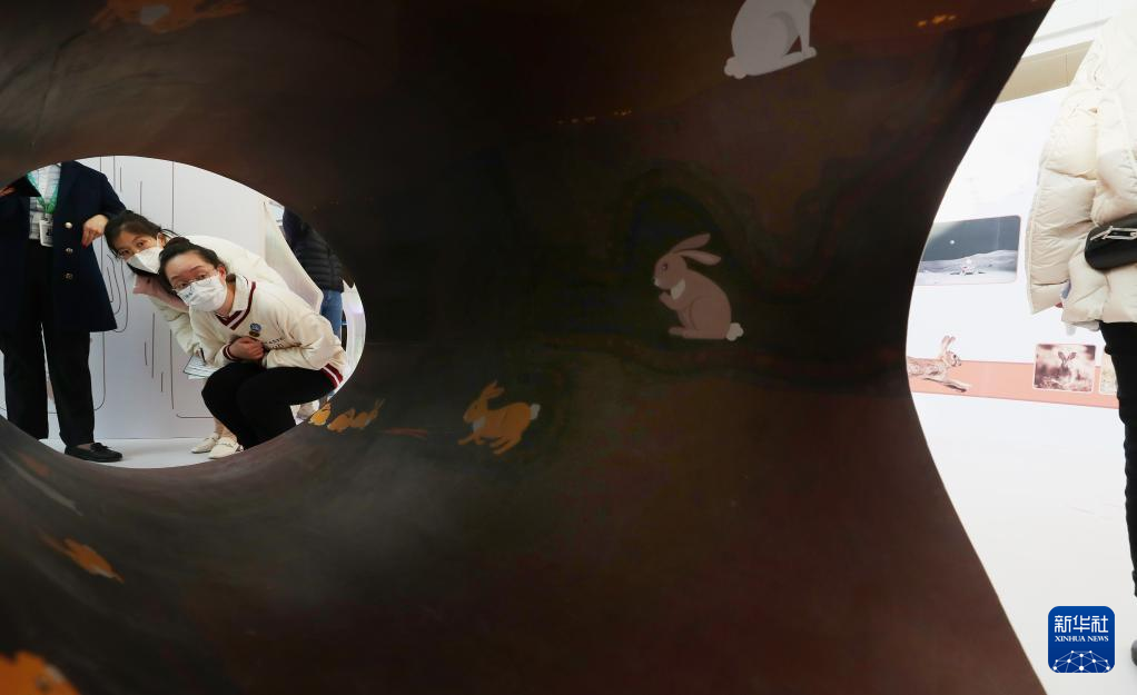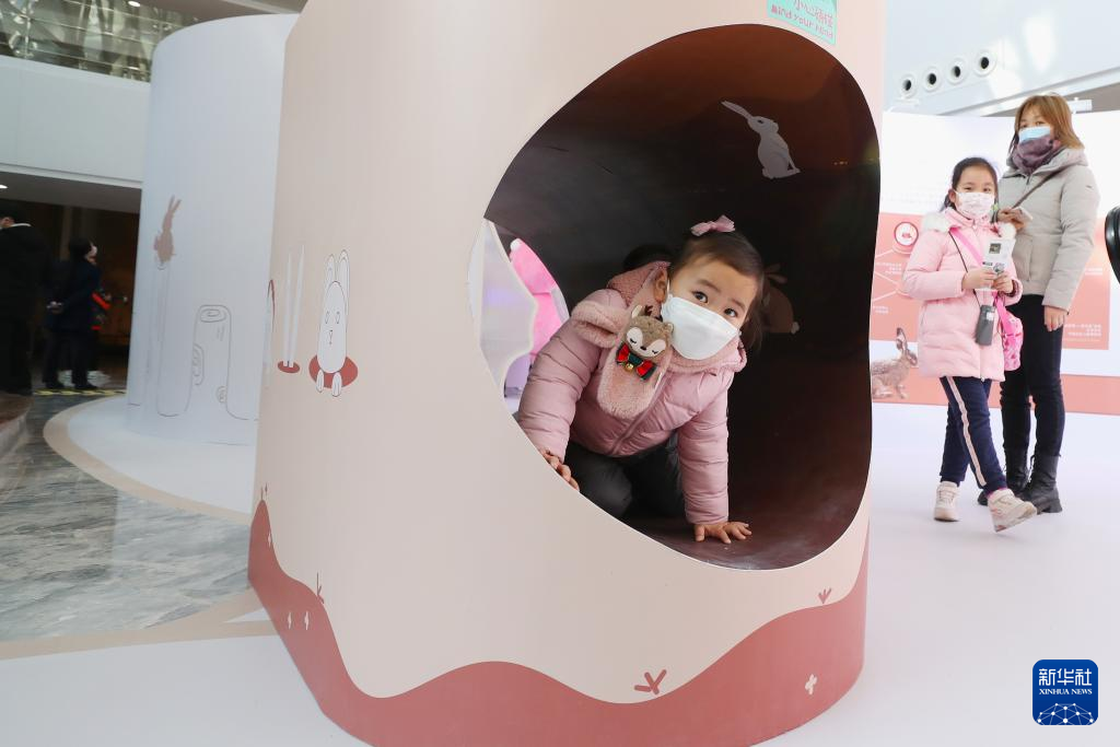 1月18日,一位小朋友(左)在展览上体验模拟兔子洞的游戏互动展品。