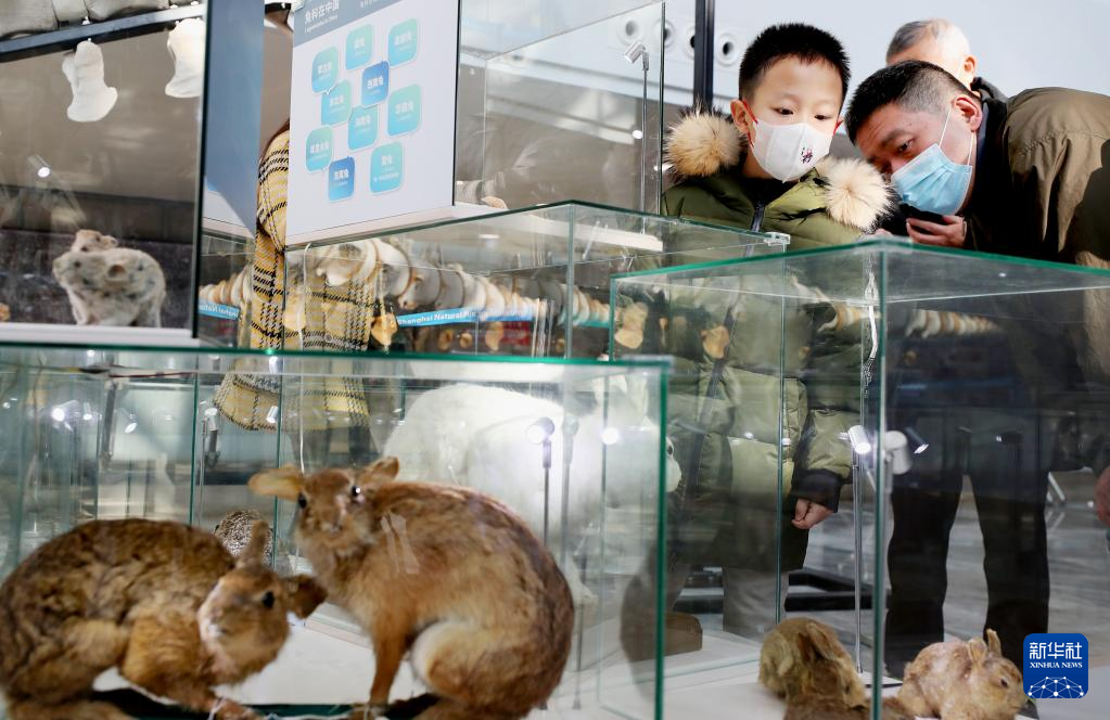 1月18日,参观者在一组兔类标本展品旁驻足观看。