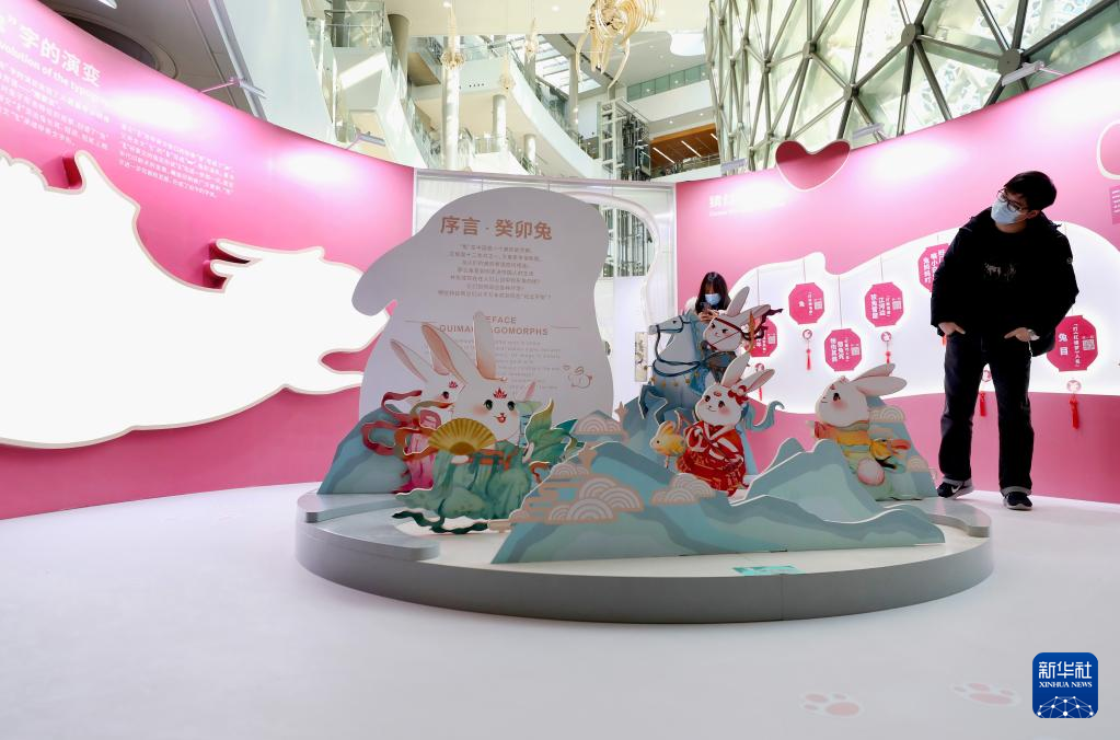 1月18日,参观者在一组兔子主题的卡通造型装饰旁驻足观看。