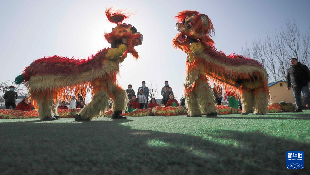 1月18日,遵化市建明镇穆家庄村的民间艺人在表演舞狮。