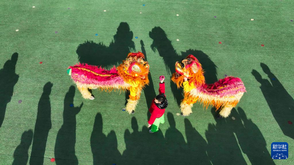 1月18日,遵化市建明镇穆家庄村的民间艺人在表演舞狮(无人机照片)。