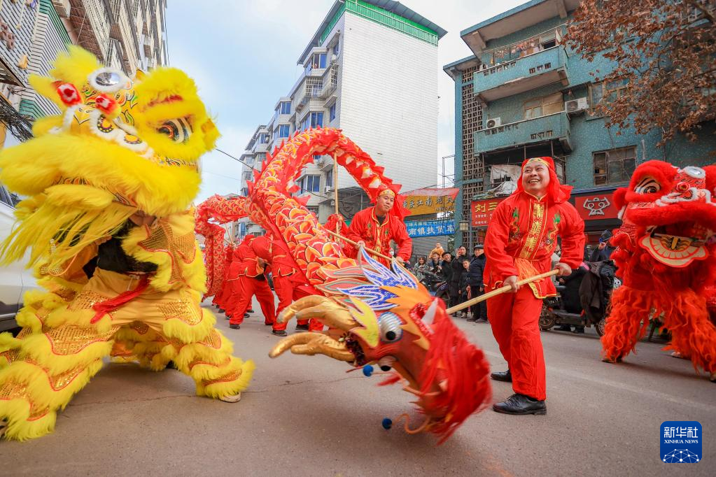1月19日,民间艺人在四川省遂宁市蓬溪县蓬南镇街头表演舞龙、舞狮。