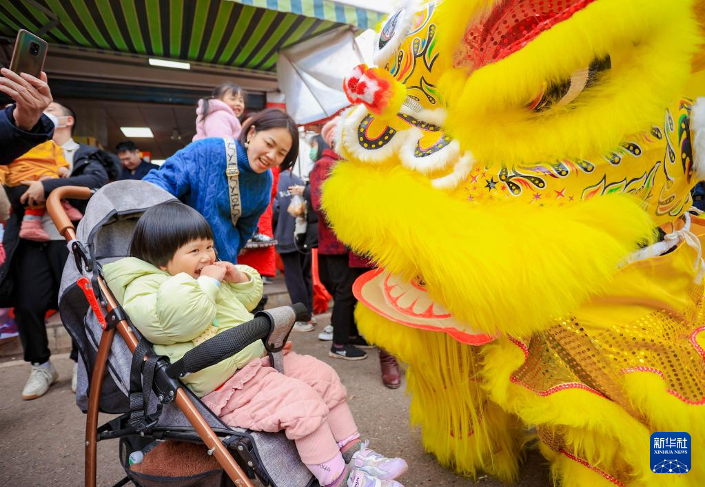 1月19日,在四川省遂宁市蓬溪县蓬南镇街头,舞狮表演者与小朋友互动。