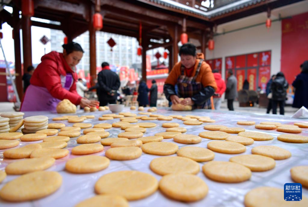 1月18日,在湖北省宣恩县举行的乡贤大会上,人们制作当地传统美食糍粑。