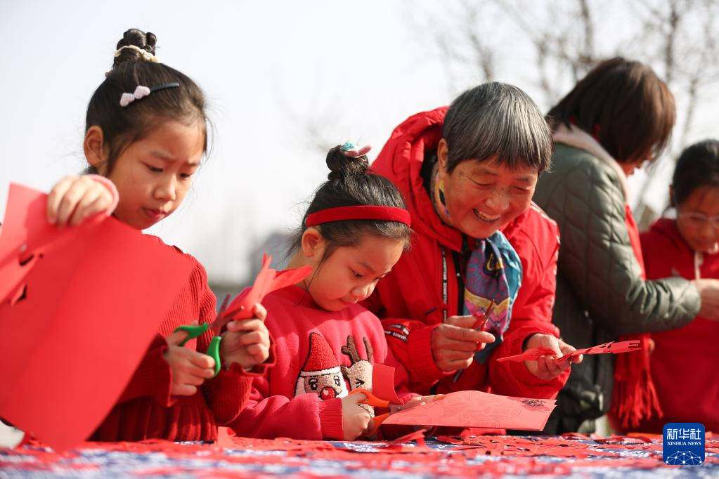 1月19日,在浙江省湖州市德清县洛舍镇三家村,孩子们学习制作生肖兔剪纸。