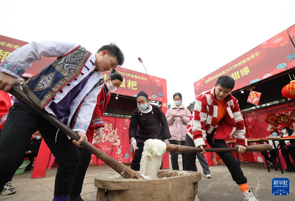 1月18日,在湖南省通道侗族自治县新春年货节上,居民在体验打糍粑。