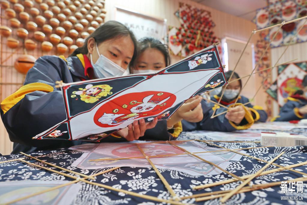 1月20日,江苏省南通市崇川区唐闸镇街道与南通西藏民族中学举办迎新春民俗文化活动,来自西藏的学生体验扎制兔子主题风筝。