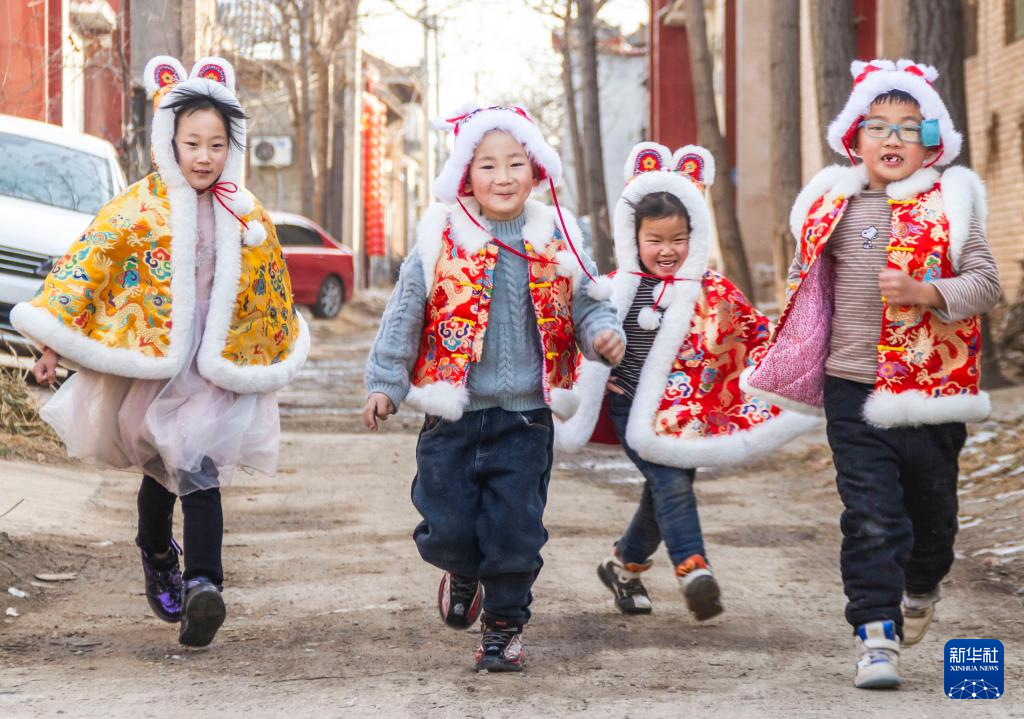 1月19日,在山西省运城市盐湖区乔阳村,孩子们穿戴兔衣、兔帽饰品玩耍。