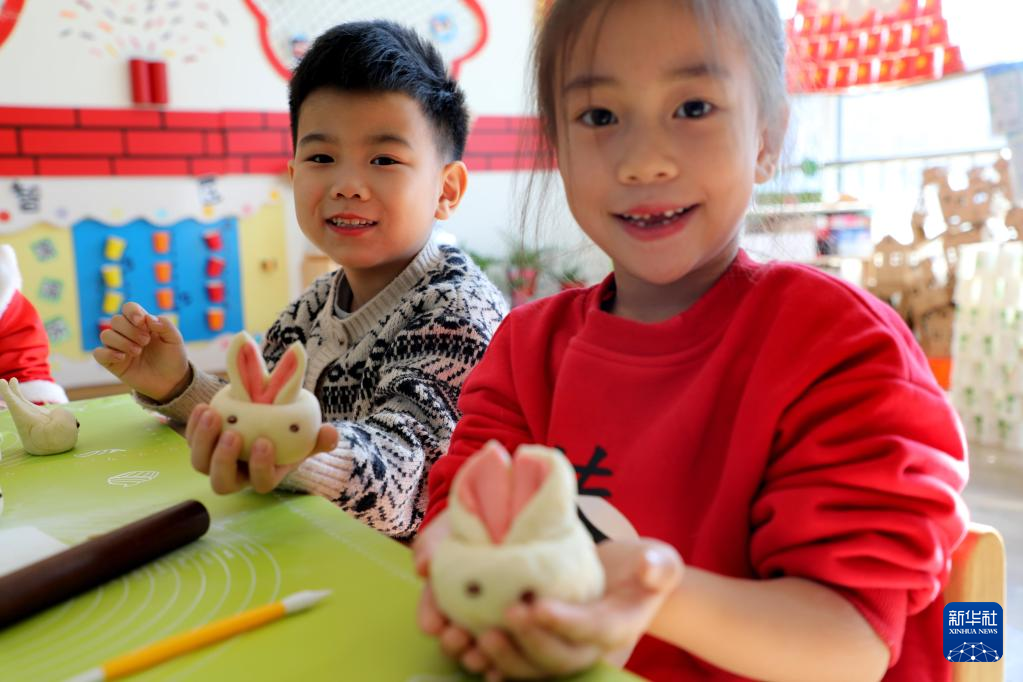 1月20日,在山东省滨州市高新区小营街道新时代文明实践站,小朋友展示和民间艺人一起制作的兔子花馍。