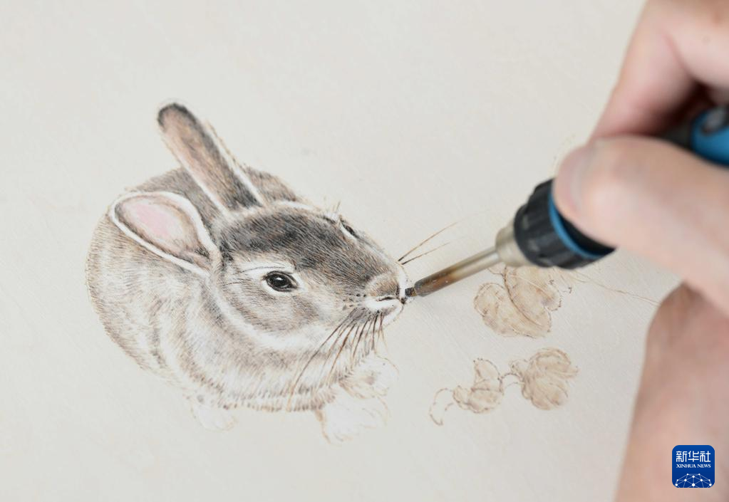 1月20日,在石家庄市新华区湾里庙步行街,烙画艺人在创作兔子主题的烙画作品。