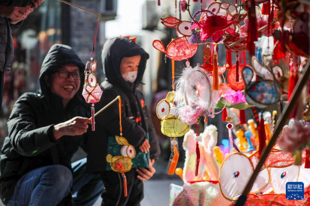1月20日,市民在江苏扬州东关历史街区购买兔子花灯。