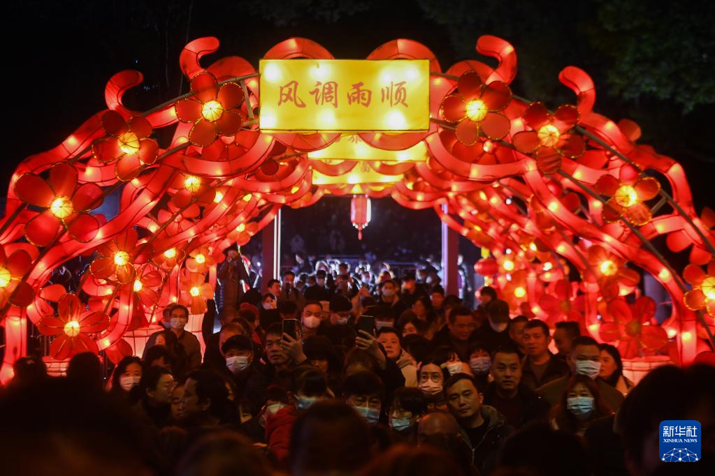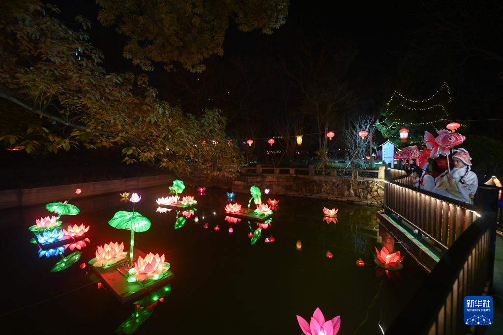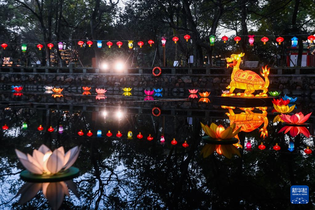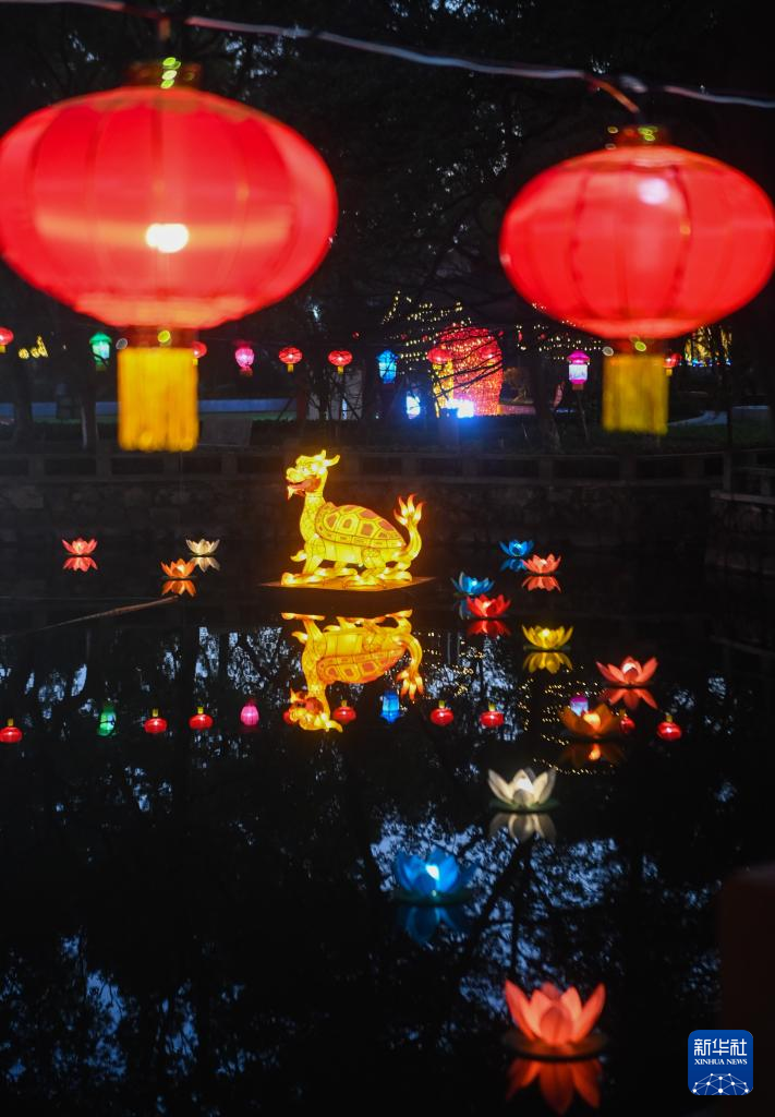 1月29日,在嘉兴市秀洲区新塍古镇小蓬莱公园内,“鳌山灯会”的彩灯正式点亮。