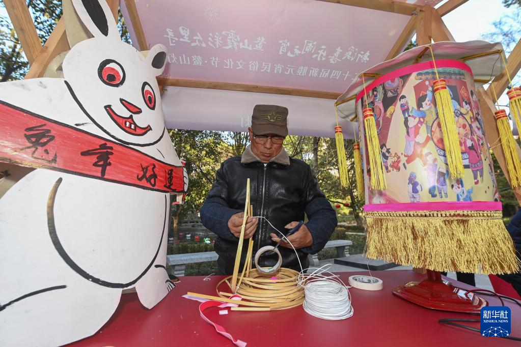 1月29日,在嘉兴市秀洲区新塍古镇小蓬莱公园内,传统艺人在“鳌山灯会”现场展示纸扎灯技艺。