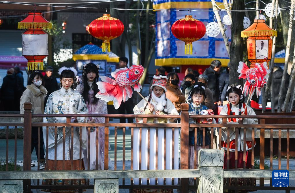1月29日,在嘉兴市秀洲区新塍古镇小蓬莱公园内,身着传统服饰的游客在“鳌山灯会”现场观赏花灯。
