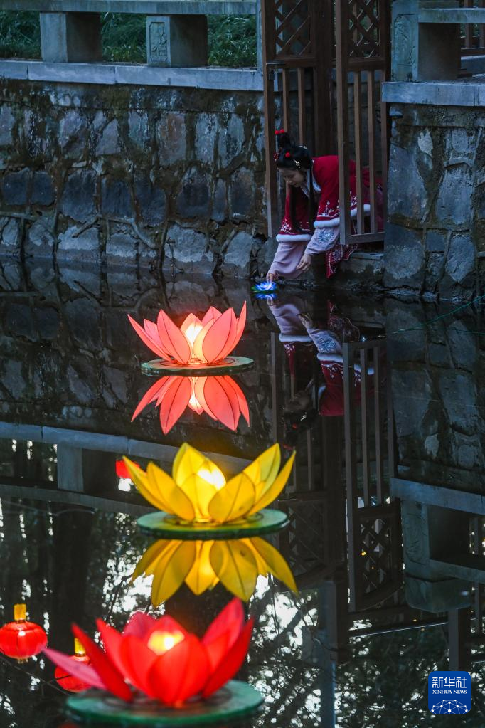 1月29日,在嘉兴市秀洲区新塍古镇小蓬莱公园内,身着传统服饰的游客在“鳌山灯会”现场放下“心愿灯”。