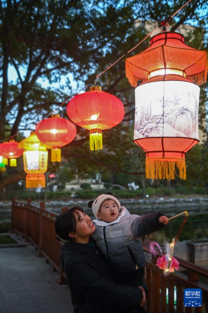 1月29日,在嘉兴市秀洲区新塍古镇小蓬莱公园内,一位家长带着孩子在观赏“鳌山灯会”的彩灯。