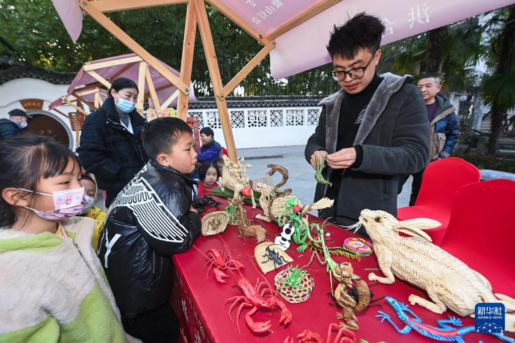 1月29日,在嘉兴市秀洲区新塍古镇小蓬莱公园内,传统艺人(右)在“鳌山灯会”现场展示手工技艺。