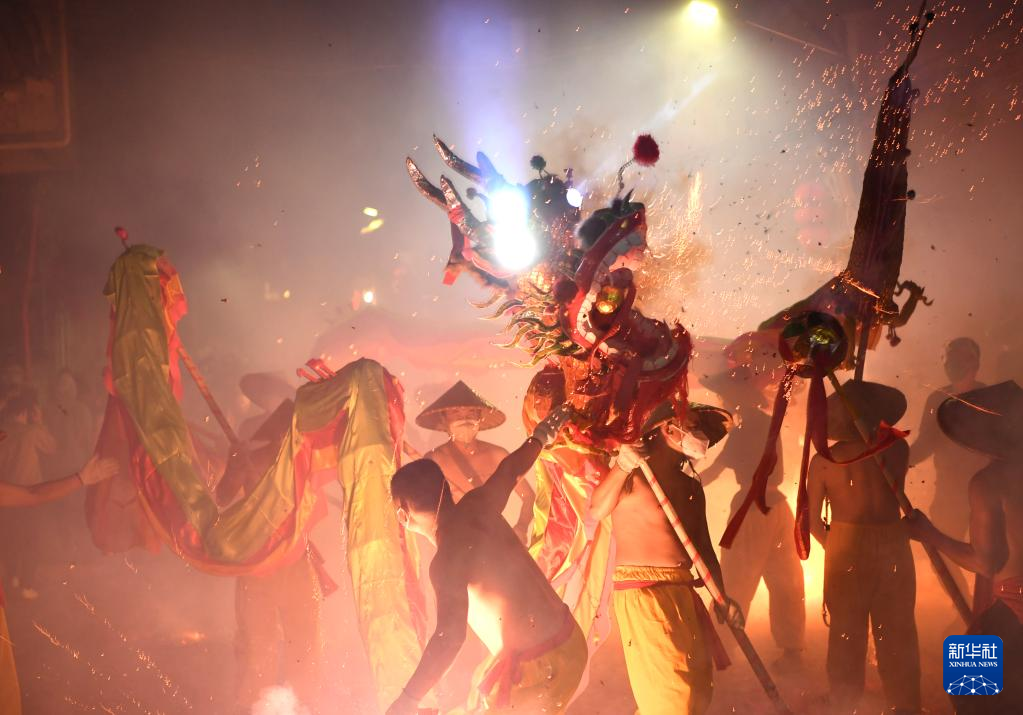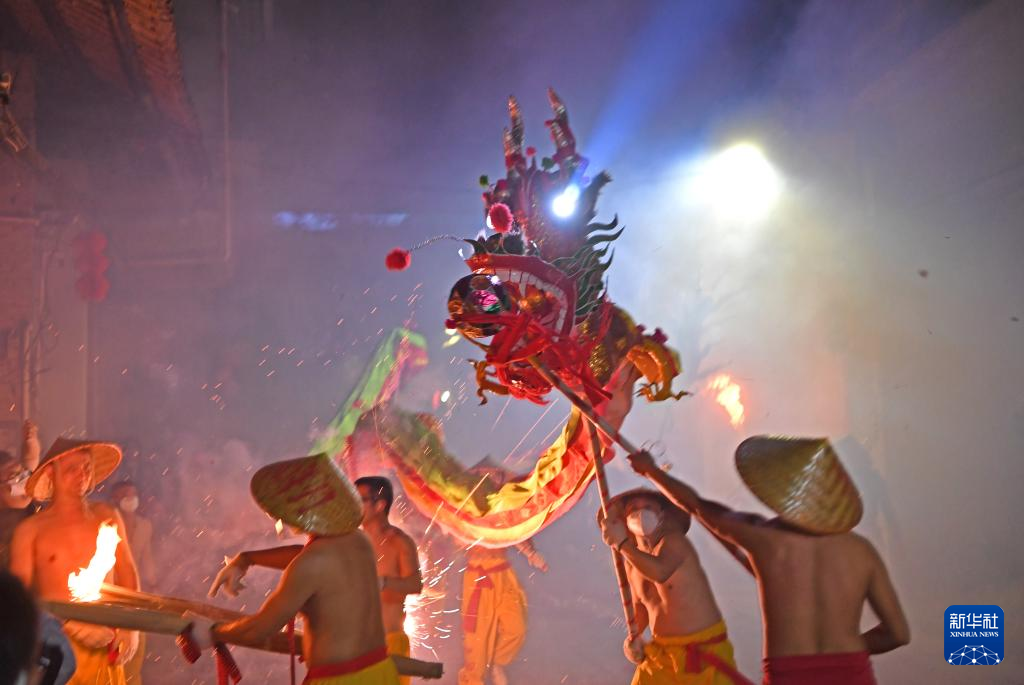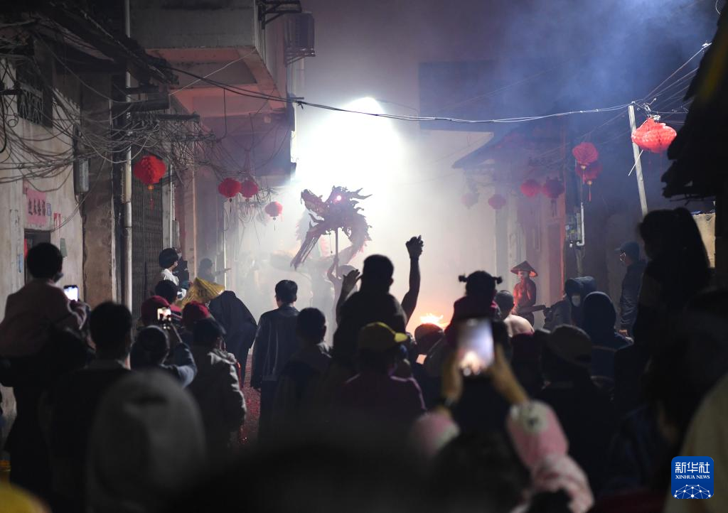 人们在广西南宁市宾阳县县城舞炮龙(2月1日摄)。