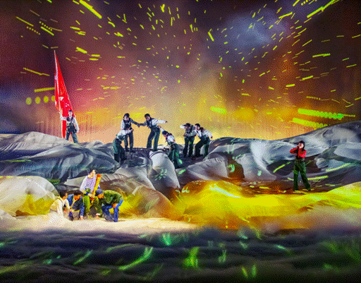 《酒曲人生》巧妙利用大量光影设计,将整个剧院打造成全景沉浸式的空间秀场,并巧妙运用AR\VR技术、光影全息技术、动态覆合、多维布景与全景舞乐等技术,打造真实震撼的星空、雪山、草地、战场……让观众置身剧院,沉浸式的体验四季的变化。