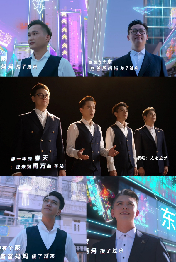 《你在爱就在》由东莞知名音乐组合“太阳之子”倾情演绎,歌曲节奏悠扬舒缓,旋律婉转空灵,词意平实真切,用温暖的声线传达了细腻深沉的感情。“太阳之子”的男声四重唱,让整首歌曲听起来非常平稳、流畅,既像波浪一样此起彼伏,又像朗诵诗歌一样娓娓道来,极具催动情感的张力和渗透力。四位演唱者的声音,就像是从不同的角度,不同的声音,不同的脚步,不同的方向,不断汇聚,最后汇集成城市的声音。