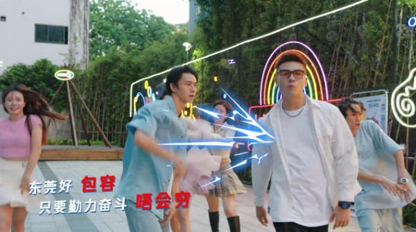 为了讲述好东莞这座无数年轻人实现梦想的青春之城的故事,此次《你在爱就在》的风格选用比较活力灵动的风格,呈现潮流的城市节奏,加上粤语说唱,整个音乐风格都更加年轻时尚。《你在爱就在》MV的视觉表现上融合文艺与科技于一体,将街舞、元宇宙、动漫、赛博等潮流元素进行多元呈现,巧妙使用实景与虚拟相结合制作手法,通过MV的音乐和画面,让人感受到了东莞城市前沿科技、时尚潮流和活力节奏。