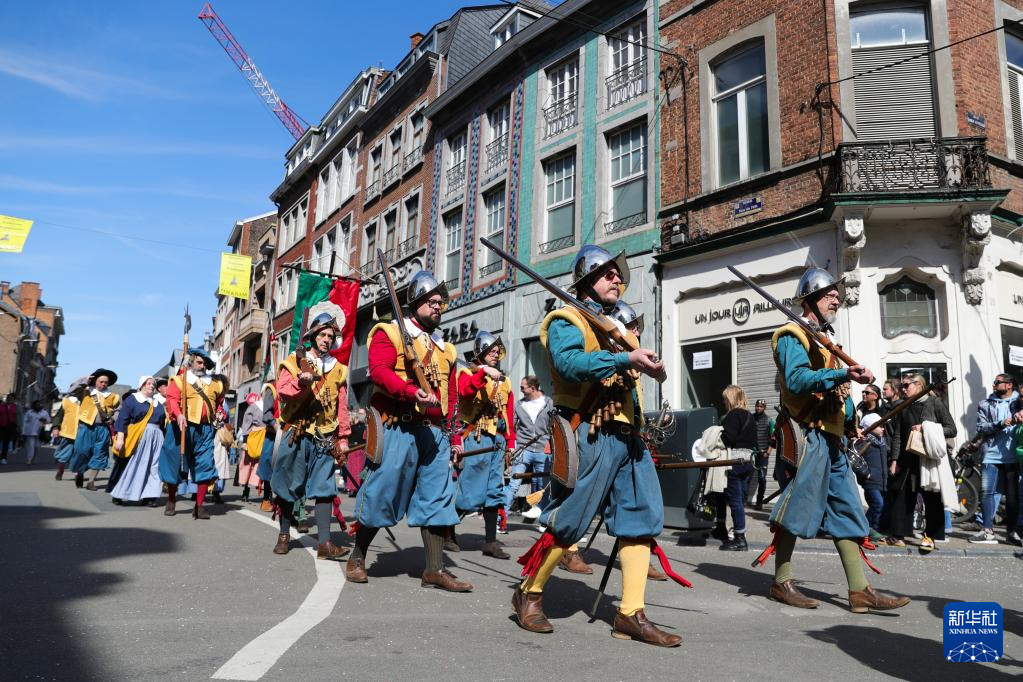 4月15日,身着古装的游行队伍在比利时那慕尔市传统民俗日活动上行进。