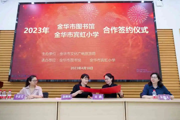 近日,在宾虹小学阶梯教室里,由金华市图书馆与宾虹小学牵手合作的“馆校联盟悦读工程”签约仪式正式启动,拉开了金华市图书馆“世界读书日”系列活动的序幕。