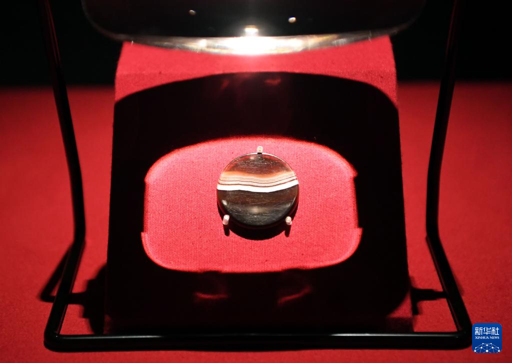 这是曹操高陵遗址博物馆内展出的玛瑙饼(4月27日摄)。