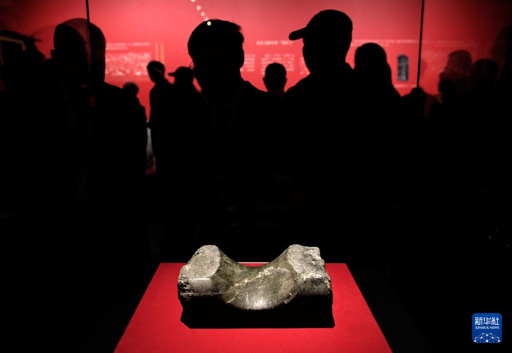 4月27日,参观者在曹操高陵遗址博物馆内观看展品“魏武王常所用慰项石”石枕。