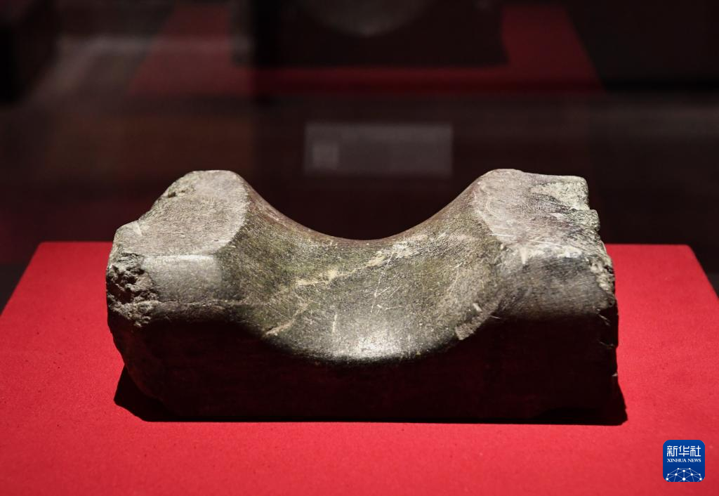 这是曹操高陵遗址博物馆内展出的“魏武王常所用慰项石”石枕(4月22日摄)。