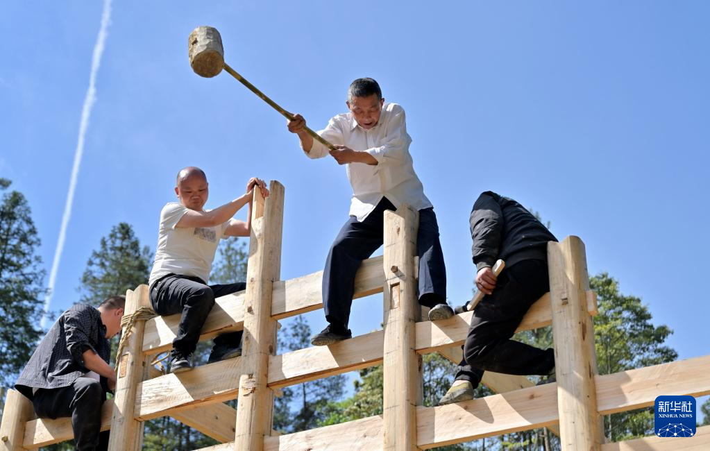 4月26日,在湖北省宣恩县沙道沟镇老岔村,村民在修建吊脚楼。